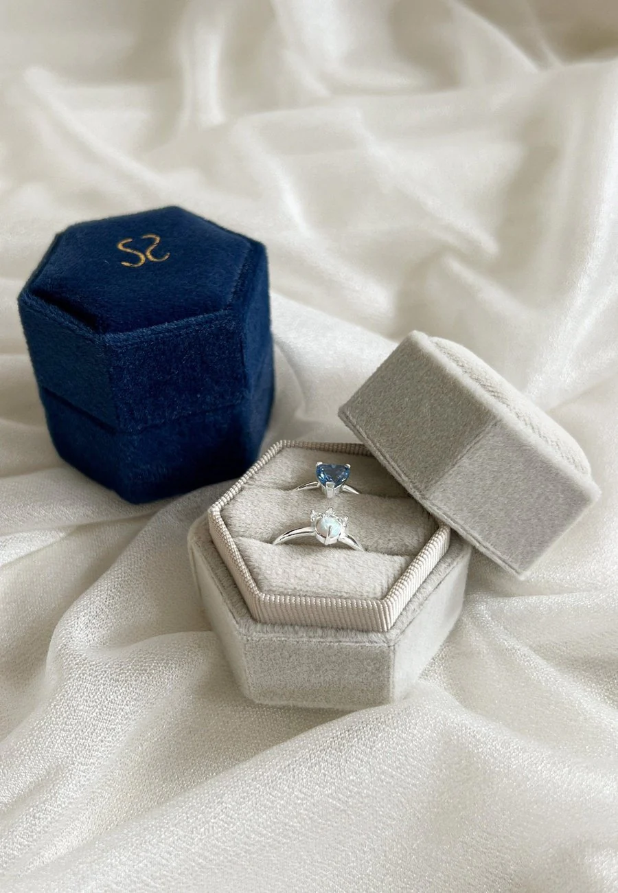 Su forma es hexagonal, lo que le da un toque de elegancia moderna. En su interior, encontrarás dos compartimentos que te servirán para dos anillos o incluso un conjunto de anillo con pendientes.