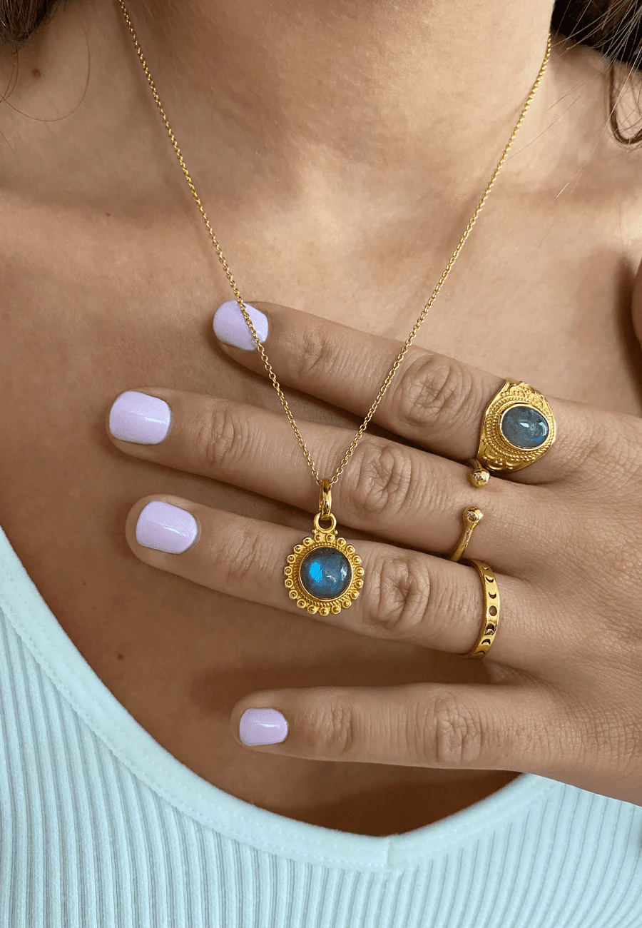 El DISHA BAÑADO EN ORO está hecho en Plata de Ley y bañado en oro de 22K. Destaca por tener una piedra labradorita en el centro, con una hilera de pequeñas bolitas a su alrededor. La tonalidad de la piedra puede variar según el collar, haciendo que cada unidad sea única y especial.