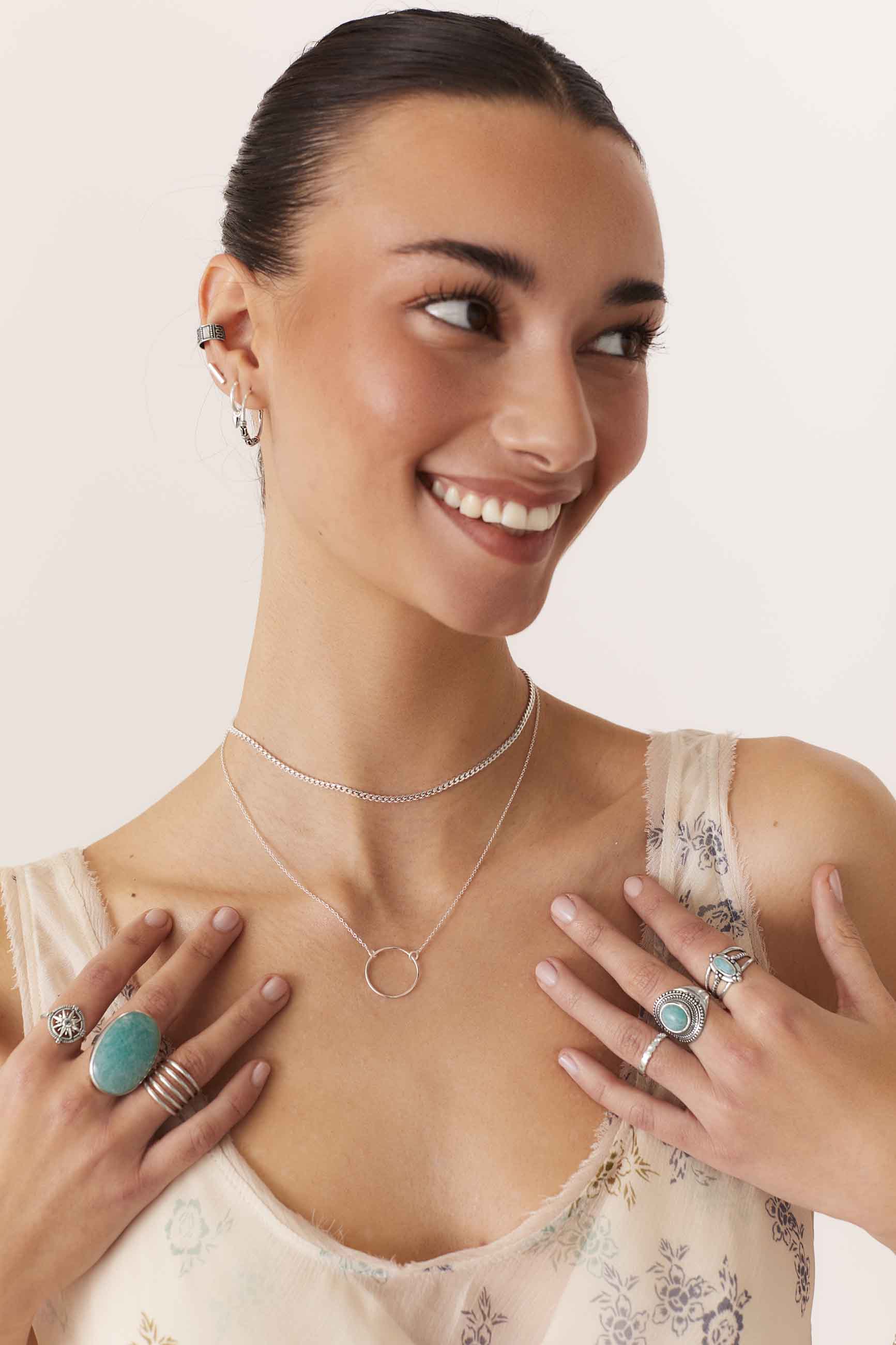 El collar círculo LALIT tiene un estilo versátil y original. Puedes llevarlo solo, o también combinarlo con unos aritos lisos o con cualquier otros pendientes que te gusten. También tenemos la pulsera ACCHODA a juego.