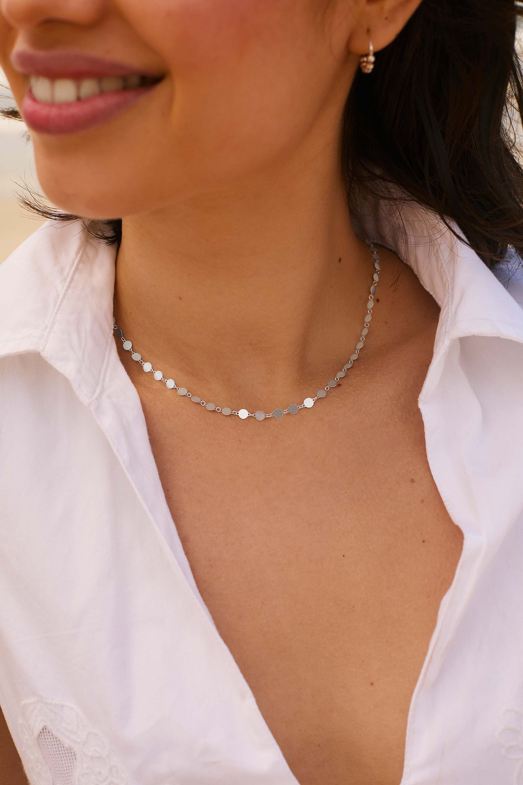 Está formado por unas pequeñas chapitas, que se unen con una fina cadena. Su tamaño lo hace versátil y perfecto para crear combinaciones únicas. Además, te recomendamos que lo combines con la tobillera o la pulsera MAHATMA, ya que comparten el mismo diseño, perfecta combinación para lucir en verano.