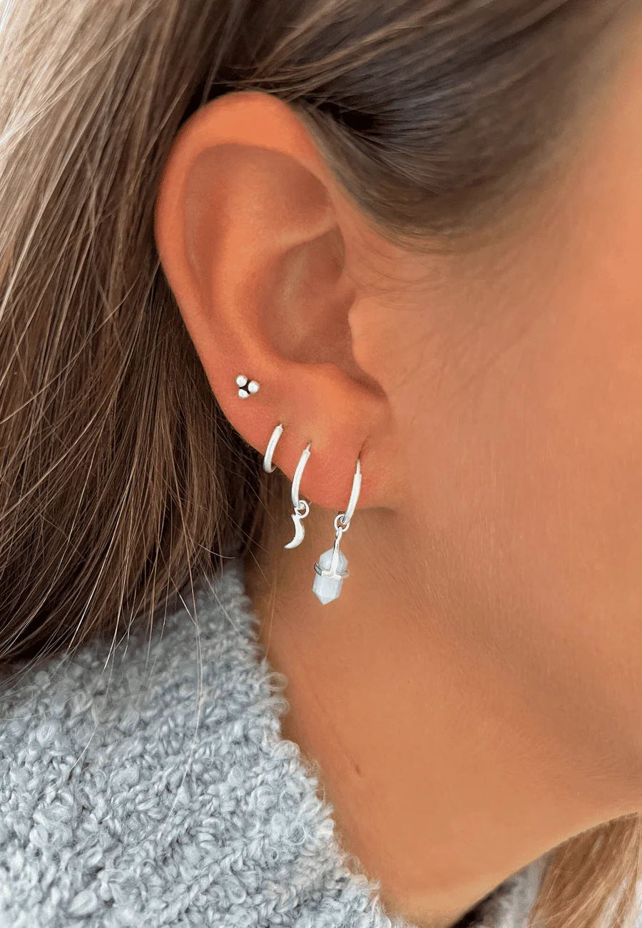 Los pendientes BHANU son aritos finos de 12 mm de diámetro de Plata de Ley 925. Tienen un colgantito en forma de luna unido a la pieza principal.