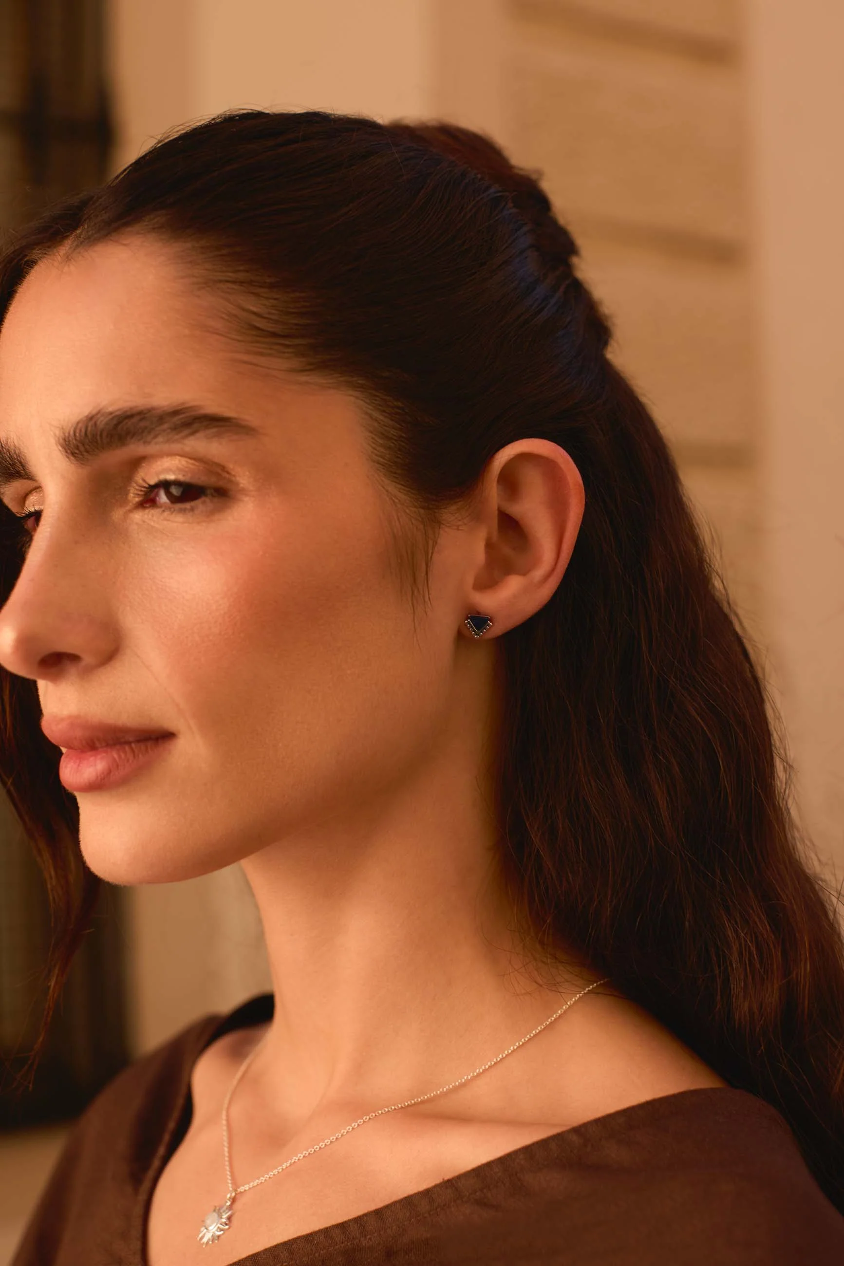 El diseño de los pendientes SHEL consta de la piedra sodalita como centro estratégico de la pieza en forma de triángulo invertido y una decoración en Plata de Ley que dibuja el borde de la pieza por la parte inferior, acompañado de unas bolitas muy pequeñitas por toda la base de plata.