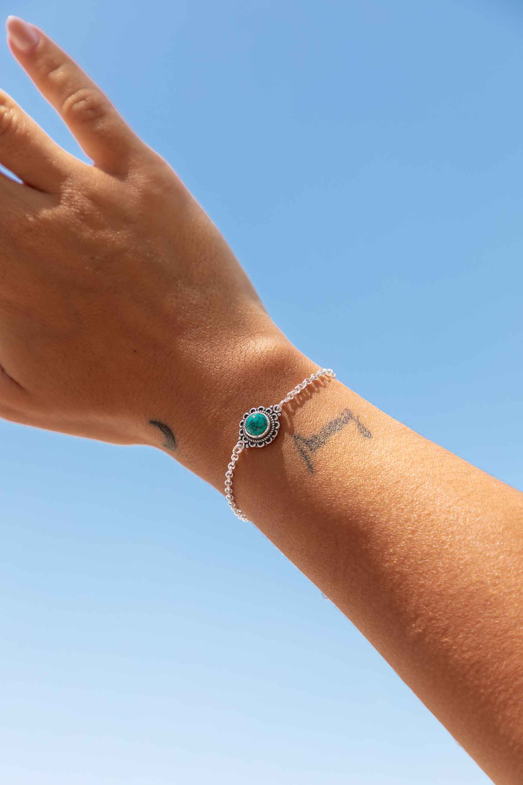 La pulsera NILA es una pulserita fina de plata muy sencillita con la piedra turquesa como elemento principal. Alrededor de la piedra encontramos un recubrimiento de plata con tres diseños diferenciados.